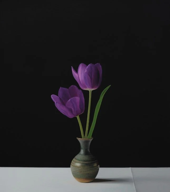 Still Life with Purple Tulips and Green Vase (Oil on Canvas)